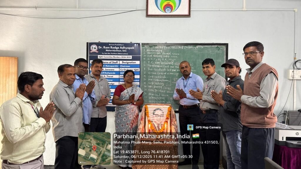 डॉ राम रोडगे अध्यापक महाविदयालय, सेलू या महाविद्यालयात महामानव डॉ बाबासाहेब आंबेडकर यांच्या महापारीनिर्वाण दिनानिमित्त विनम्र अभिवादन करतांना